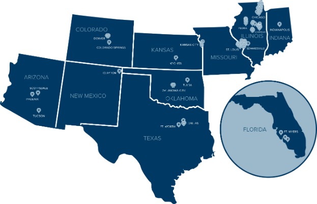Busey is proud to serve our communities in 80 locations across the country, including in Arizona, Colorado, Florida, Illinois, Indiana, Kansas, Oklahoma, Missouri, New Mexico and Texas.